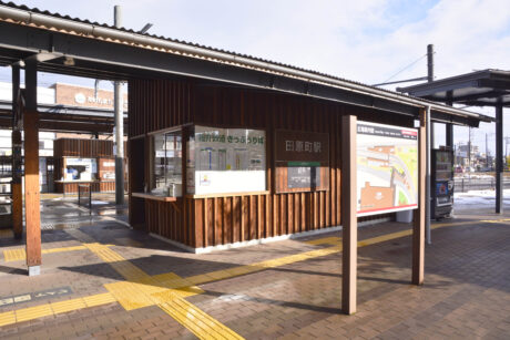 福井鉄道の駅舎外観。左が鷲塚針原(西)方、右が越前武生(東)方。
