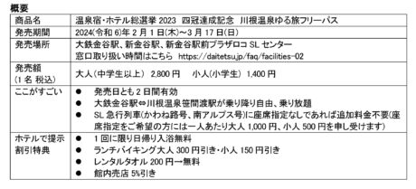 「温泉宿・ホテル総選挙2023 四冠達成記念 川根温泉ゆる旅フリーパス」の発売期間や、発売場所、発売額、有効期間、フリーパス区間などは下の表にて。