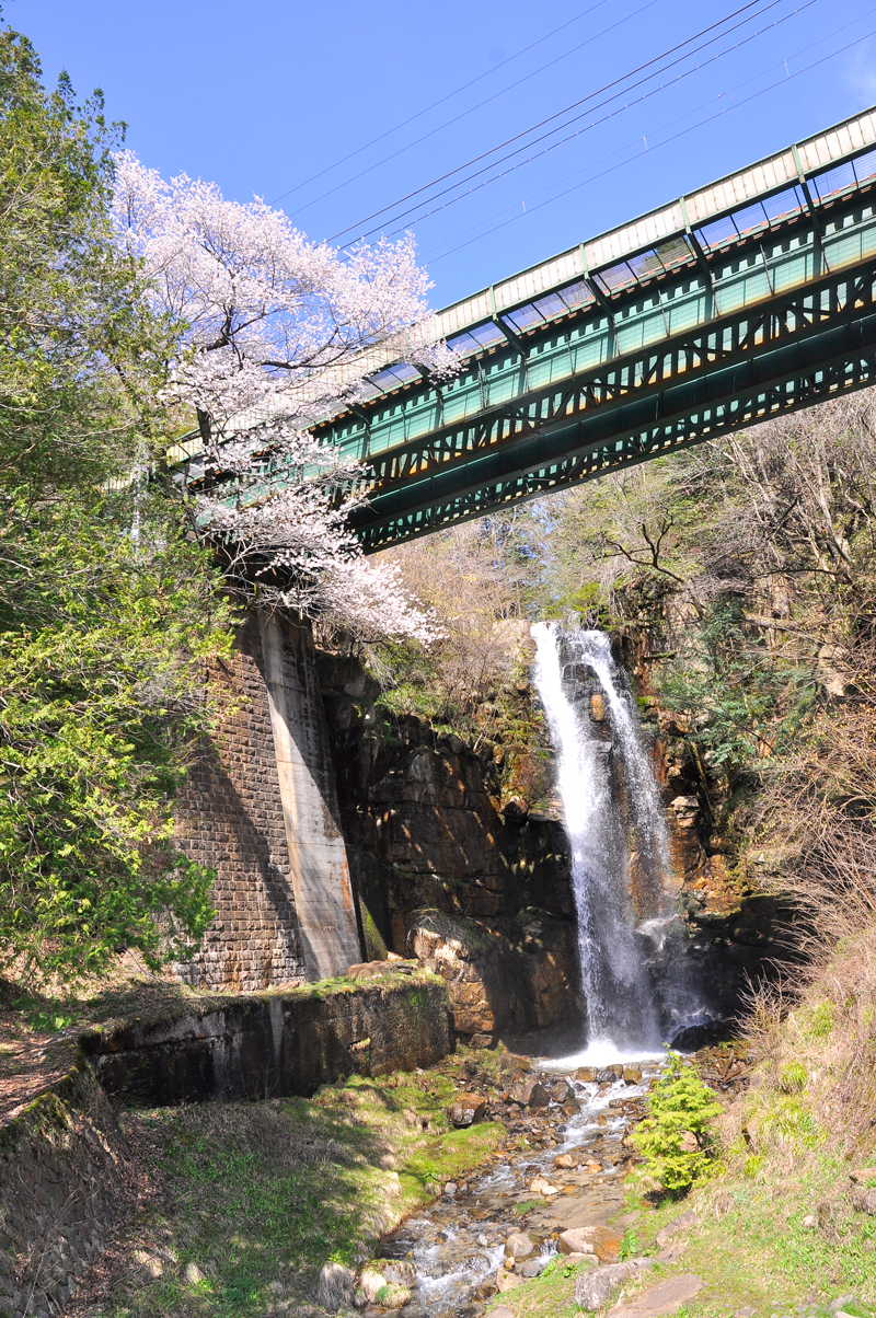 位置は倉本駅から上松寄り約3.5kmの地点。滝の落差はおよそ20mで、滝口は鉄道橋よりやや高い場所にはあるが、電車の車窓からだと滝の瀑布を見下ろす感じになる。平行して通る国道19号線からも眺めるられ、こちらは滝つぼに近い高さに位置しているので瀑布に近づけて、直漠の迫力を体感することができる。