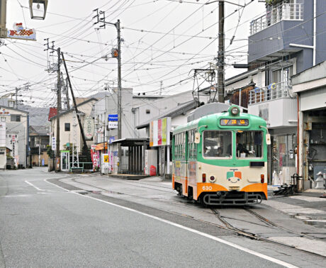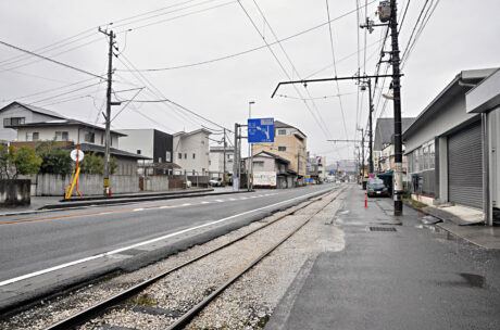 上写真のクリーニング屋さんの先からの南東向きの眺め。電車は600形617。それでは、そのような区間の路肩軌道を眺めていこう。