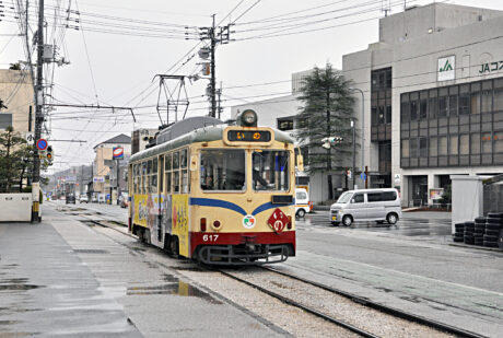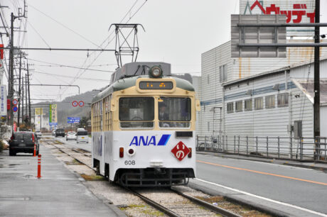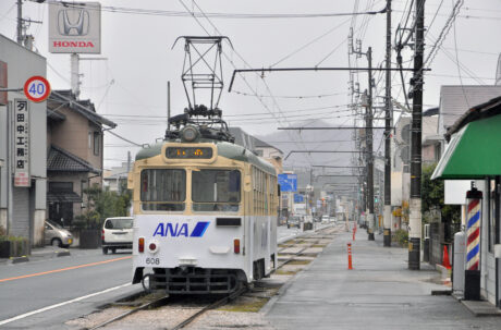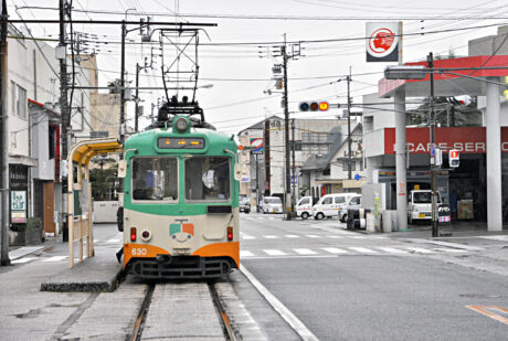 北山電停へ西側から到着する電車600形608。一見危ない場所にて撮影しているように見えるけれども、実は安全地帯から撮っている。