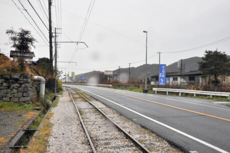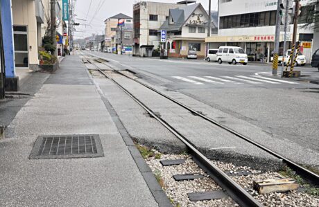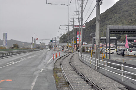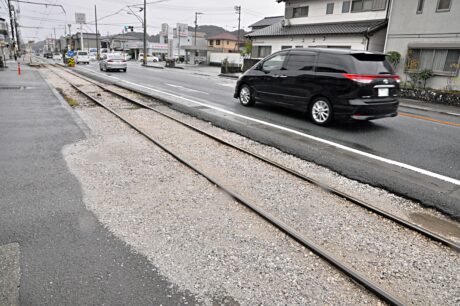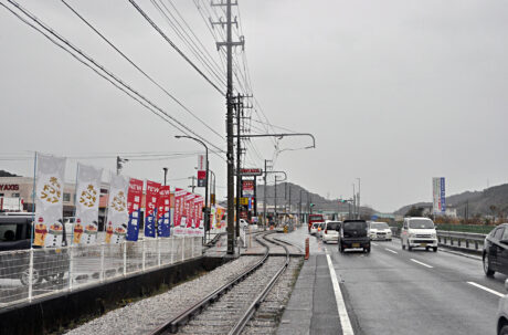 そして上写真の地点からの東向きの眺め。店舗や駐車場の前だったりは舗装してある。安全地帯標識のある場所が鳴谷電停。伊野駅前電停より西側(伊野電停方)は併用軌道であったが、東側は軌道の大方が道路の路側帯外側へ未舗装にて敷設されていて、ある意味では路肩に専用軌道として敷設したスタイルの区間になる。