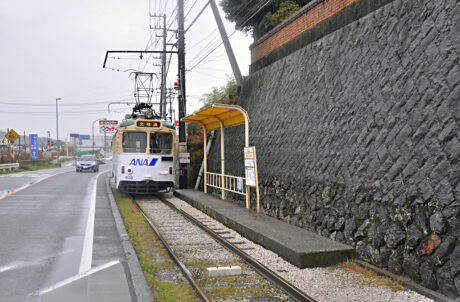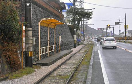 「この項にて紹介している「北山電停」は、国道194号拡幅工事などにより、2021年3月25日に新線路へ切り替わりました。なので、本記事アップ日時点ではこの辺りの状況は変わっていて、もぉこの景色を見ることはできません。本サイトは『鉄道 旅のガイド』という性格上、アップ日時点において存在していない線路物件は掲載しない方針なのですが、この度は『シーナリーガイド』的感覚にて閲覧していただきたく紹介させていただきました。ココにて掲載の北山電停の写真は以前の姿であって、すでに見られない停留所スタイルを紹介していることをご理解いただきたくお願いいたします。」