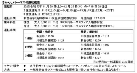 2025年10月24日追記:24日に、トーマス号の運休期間が、11月1日〜30日 の間に拡大。EL列車での代走運転をいたします。…との発表がありました。