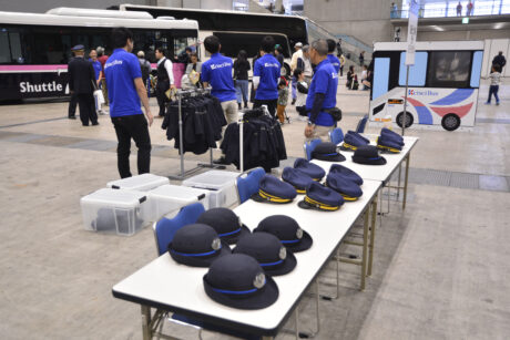 お子様運転士体験(バス型の顔ハメで記念撮影)に貸し出されるお子様用運転士制服。2019年の撮影のためイメージ。