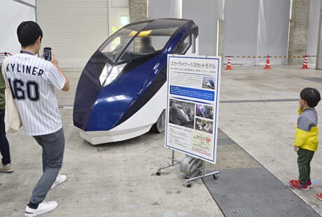 AE形スカイライナー1/2カットモデルの顔ハメも、きてくれるらしい。2024年の撮影。展示予定のバス車両は、京成電鉄バスグループ4社の新しいカラーリングの車輌をはじめ、燃料電池バス(東京BRT)、電気バス(京成バス千葉ウエスト)、ふなっしー号(京成バス千葉セントラル)、路線バス(京成バス)を予定。