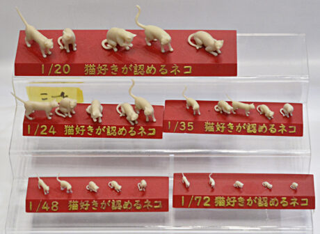 猫好きが認めるネコシリーズ、1/12スケールと1/16スケール。 猫好きが認めるネコシリーズ、1/20スケール~1/72スケール。 1/72スケールが、ギリ鉄道模型の16番1/80スケールに使用できる(個人の感想です)かな? という大きさになろうか!?