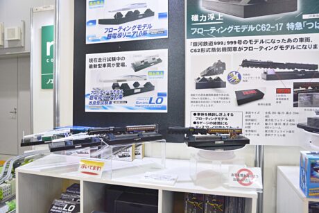 フローティング(磁力浮上)モデル展示スペース全景。 上写真の中央左のアップ。 以前のC62タイプSLのフローティングモデルは「銀河鉄道999」だったから違和感がなかったけれど、実際に存在したC62 17SLだと、何か不思議な感覚になる。