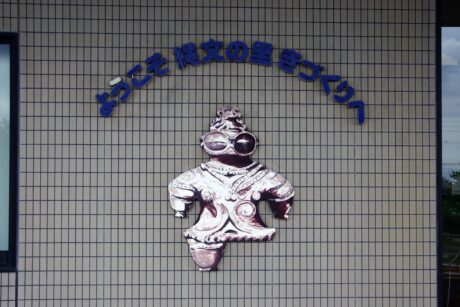 「つがる市縄文住居展示資料館 カルコ」の玄関脇で、縄文式土器と遮光器土偶のレプリカが出迎えてくれる。