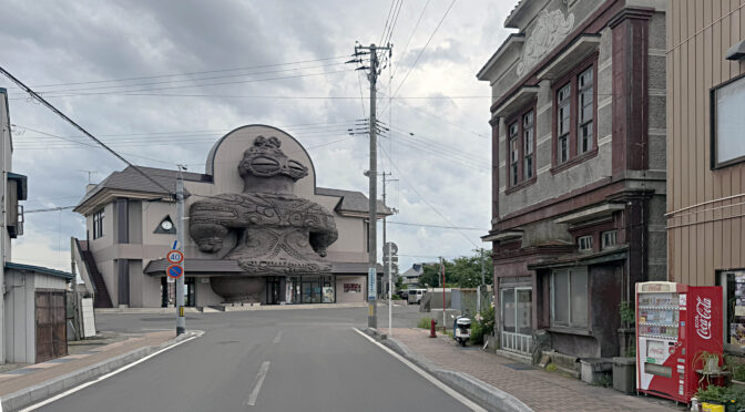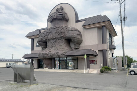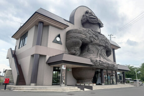 遮光器土偶が出入口に仁王立ちする津軽の駅
