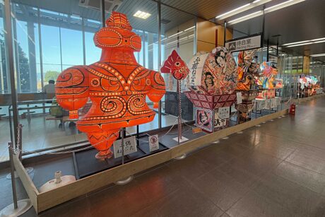 JR新青森駅コンコースに展示されている「土偶ねぶた」。ネブタまつり直前の訪問時の写真のため、アップ日時点ではイメージになってるかも(汗)。