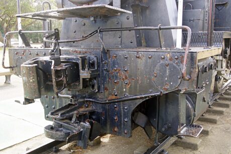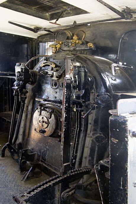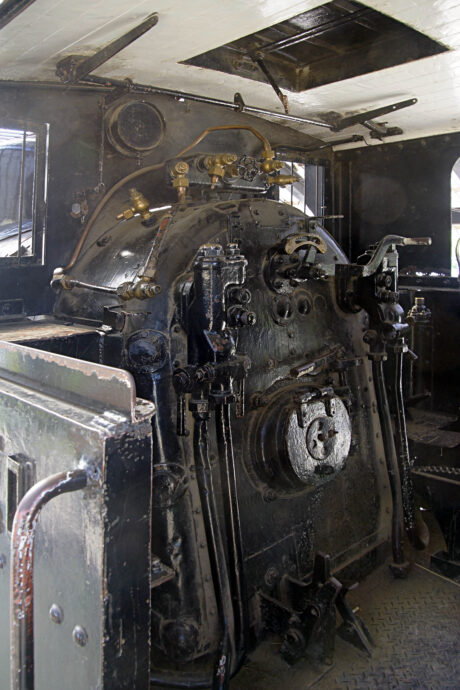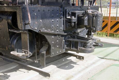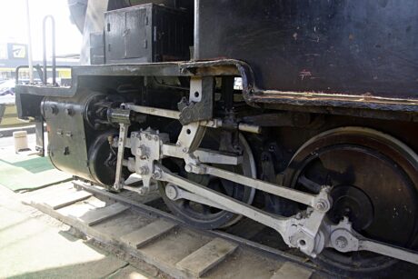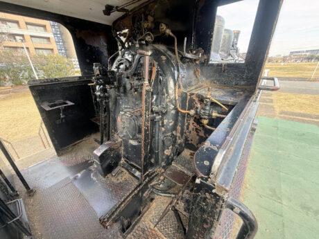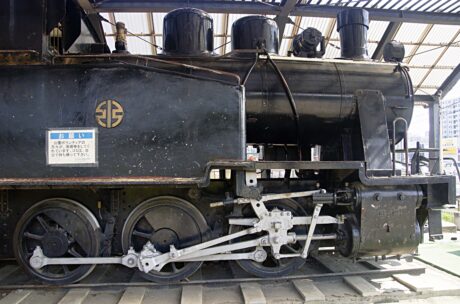 NUS6号の後面(機関室側)は、機関室へ入るための階段がコンクリート製なのと上屋の柱のため、動輪全体を斜め後ろよりのベストな向き&距離から眺めることはできない。