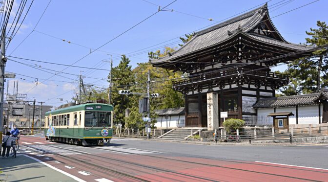 京都市右京区太秦の広隆寺仁王門は、目の前を嵐電の路面電車が横切っている写真スポットとして昔から有名だが、筆者はこの地点の複線線路が路肩軌道なことをスッカリ忘れていた。