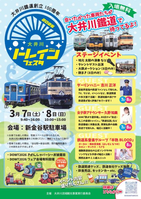 上の項で「トーマスフェア新金谷会場」が開催されることを発表したけれども、その初日3月7日(土)と8日(日)の2日間にこのトーマスフェア新金谷会場の隣のプラザロコ側プラザロコ・マルシェ・ステージエリアで、「大井川鐵道創立100周年トレインフェスタ」が大井川流域観光事業実行委員会の主催により開催されるよ。