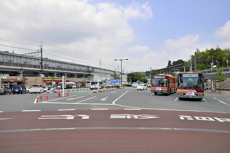 駅前広場東側から千葉方面を眺めたところ。現在は二股に分かれた間を駅前広場に利用している。手前2台のバスは小湊鐵道の左が日産ディーゼル工業UA系(富士重工7E)、右が三菱ふそうエアロスター。