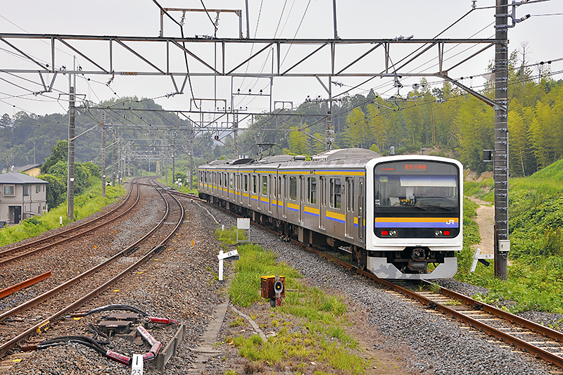 外房線下りホーム千葉寄り端から土気駅方向を眺めたところ。右の209系電車が走っている線が現在の東金線へと接続する線路で、左のカーブした複線が外房線。東金線側が元々は直線で延びていたであろうことが窺われる点からも、こちらが本来の主本線であったことが察せられるだろう。ちなみに、1972年5月26日の大網駅移転前夜までの旧線は、この辺は単線で使用していたという点も加味しと眺めると当時の姿を連想しやすい。