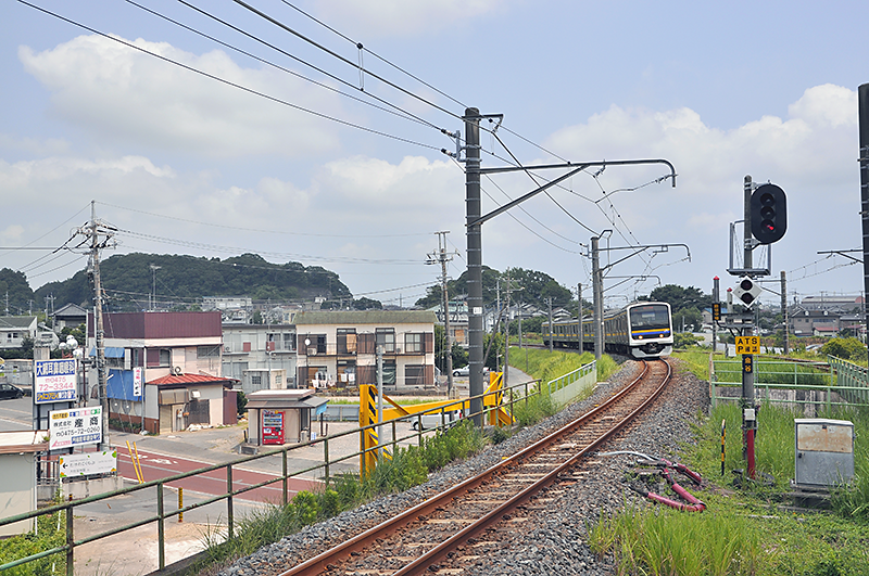 外房線下り線ホームから北側を遠望して捕らえた東金線を走る209系電車。直線になっている辺りが旧大網駅跡。