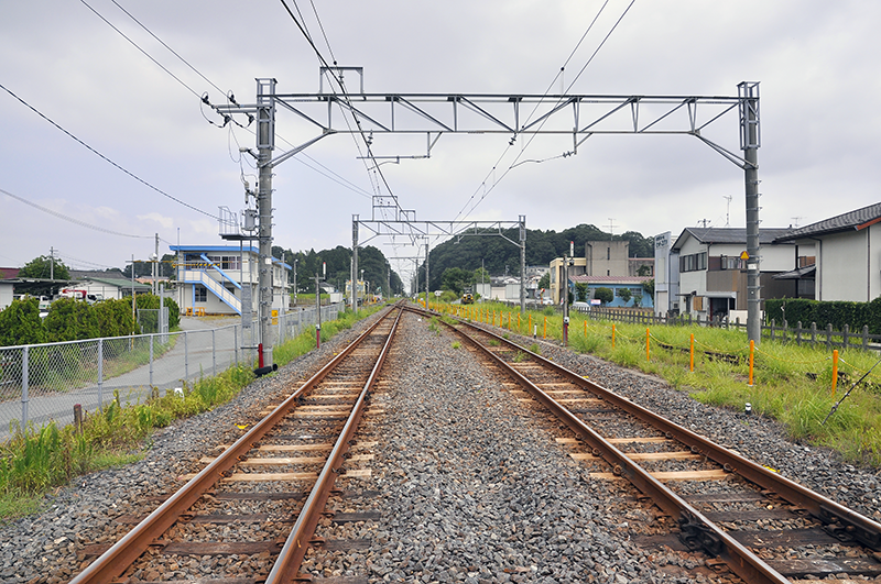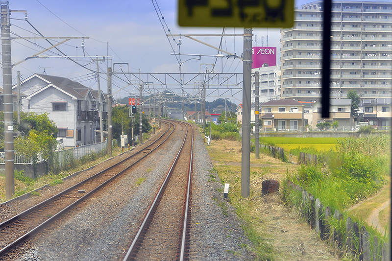 永田寄りの分岐があった地点を、下り電車最後尾から大網方を展望したところ。架線柱がそこだけワイドスパンになっているので判りやすい。