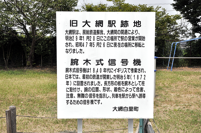 旧大網駅駅舎跡地に開設された児童公園。腕木信号機の右の旗のポール下に歌碑がある。