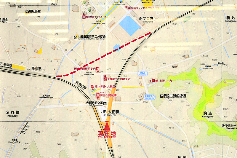 大網駅に掲示されていた地図に、旧線跡を赤い破線で書き込んでみた。左が北で多少見づらい点はお許し願いたい。