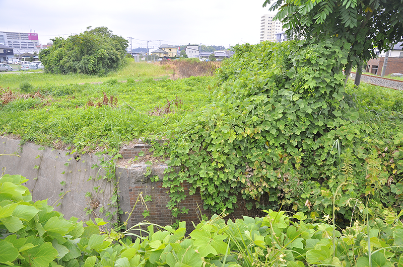 上の地点からの反対側、茂原方の眺め。左上の樹木と右の金網の設備の間が線路が通っていた場所のようだ。盛夏に訪れため、せっかくのレンガ造りの橋台が草でほとんど見えないのが残念。