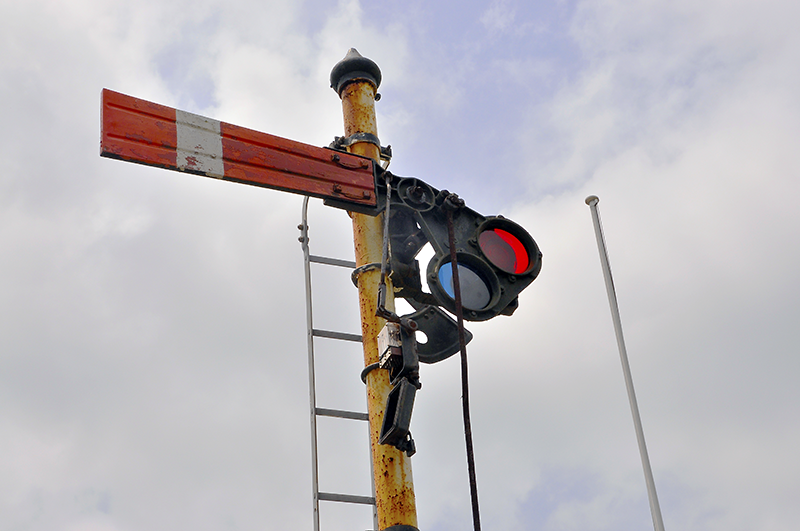 せっかくなので腕木信号機の細部写真をお見せしておこう。ちなみに、ここでは信号てこが信号機の真下に配置されているが、そんなことはありえないということは、このサイトの読者諸氏なら百も承知のことと思うので、あえて腕木信号機の写真ではキャプションを省略してある点をご理解いただきたい。
