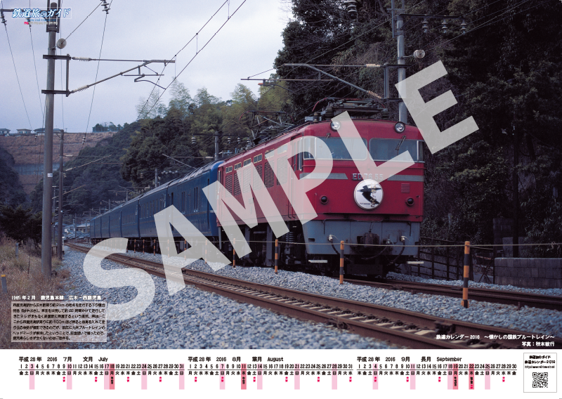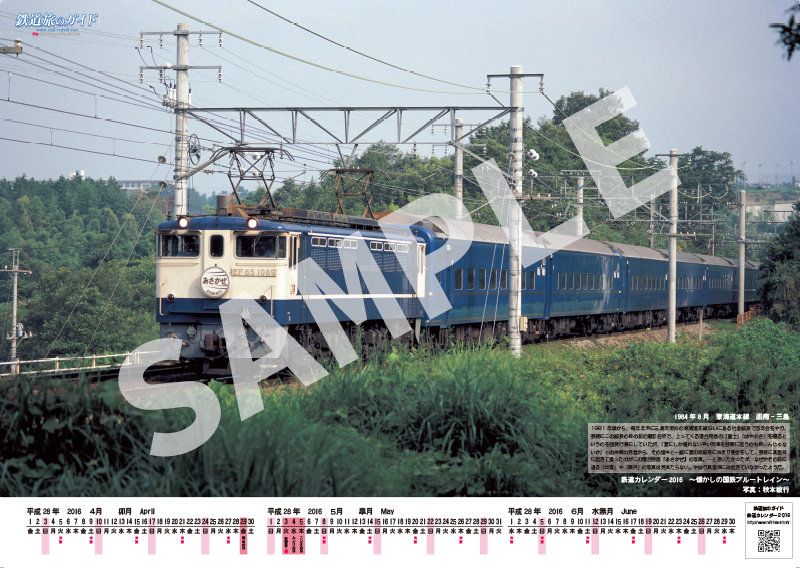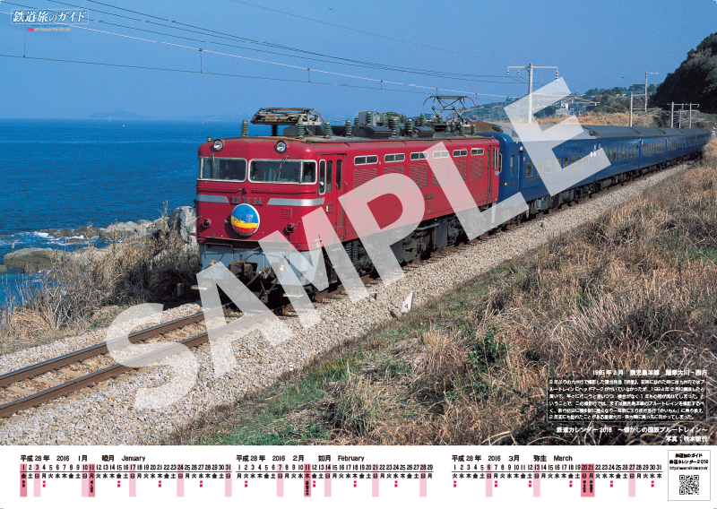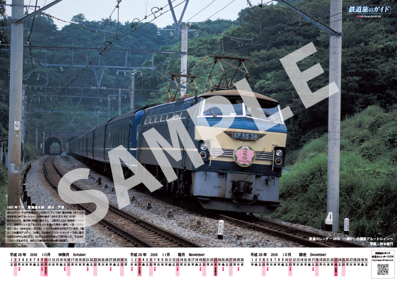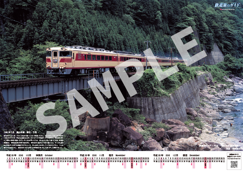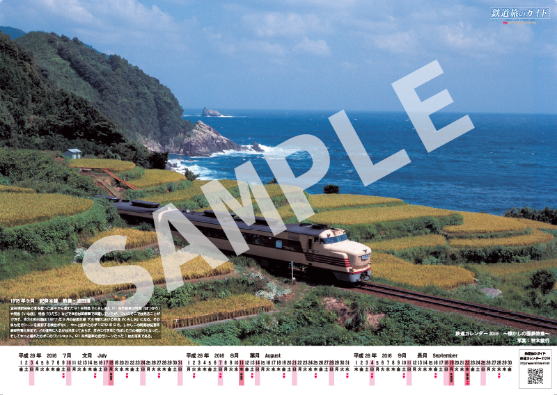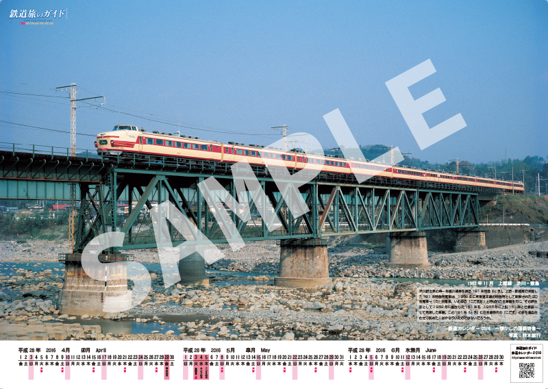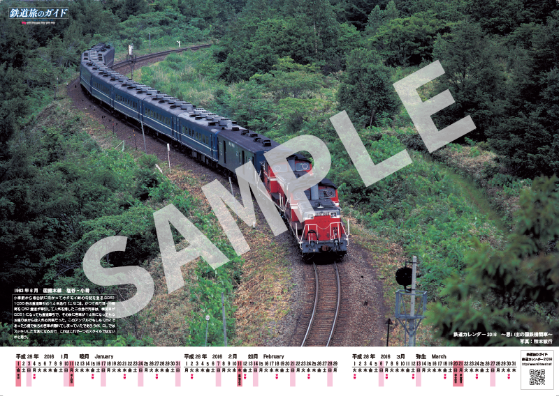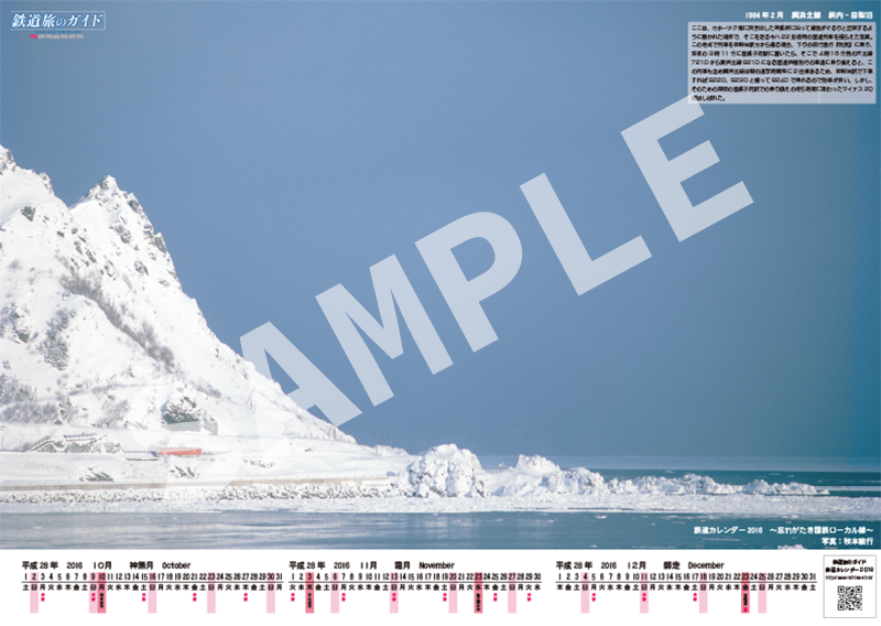 各3ヶ月ごとが1枚づつ独立したポスターになっているA2判サイズ420mm×594mmの鉄道カレンダーを発売いたしました。写真は『鉄道 旅のガイド』でメイン記事を執筆している 秋本敏行 の撮影。カレンダーは1枚1枚なので、ポスターのように壁に貼れて、使用後も月日の部分を切り取れば(そのままでも勿論OK)ポスターとして部屋のディスプレイにもなる斬新な仕様になっています。ぜひ貴方のコレクションに加えていただきたく、お願いいたします。