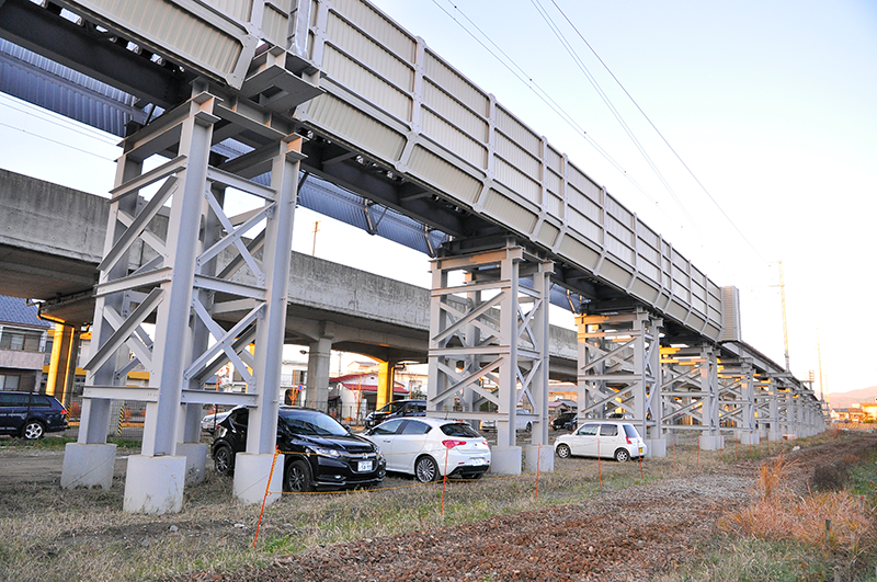それは、元々は えちぜん鉄道の福井駅は新幹線高架の東側の地平にあったのだが、この駅を高架にするために一時その仮線として利用する場所として白羽の矢が当たったのが、2015年の時点では空いていた北陸新幹線の高架だったというわけで、えちぜん鉄道福井駅を一旦新幹線の高架上に仮駅として移して、空いた元えちぜん鉄道 福井駅の跡地に えちぜん鉄道 福井駅を高架で造るという事業計画になっている。