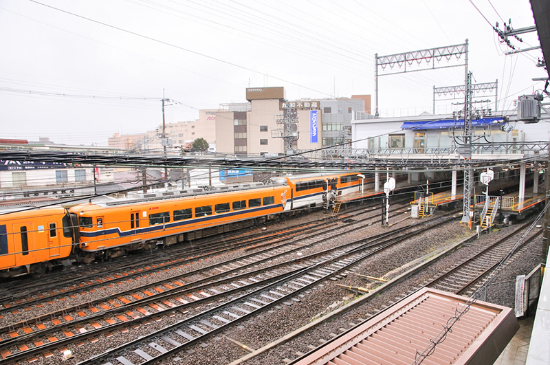 難波方の西側にある駐輪場から『展望デッキ』を眺めたところ。右の線路上の建物の青い日よけオーニングがある場所が『展望デッキ』になる。電車は京都線下りから1番線に入る30000系ビスタカー4連+22000系ACE2連の6連。駐輪場の許可を得て撮影。