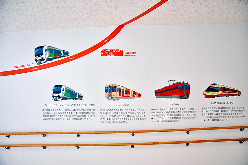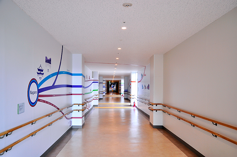 なお、この連絡通路には長野駅1番線の装飾ガラスの他に、『信州トラベルライン』と銘打って、両側の壁面に「信州の楽しい列車旅」をコンセプトとした壁画も貼られている。これらは、JR東日本と長野美術専門学校が連係して、そこの学生たちの提案によりデザインされた装飾だそうだ。