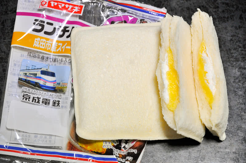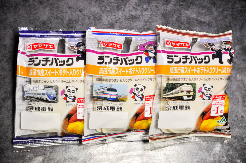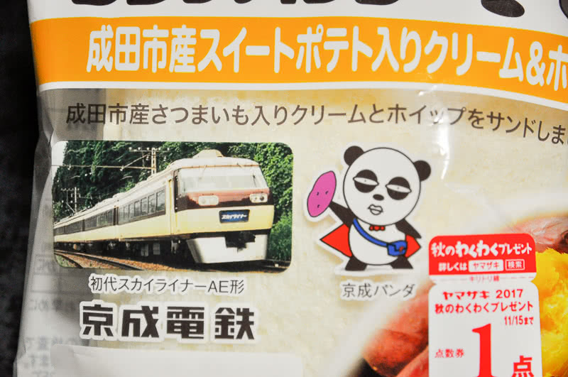『ランチパック 成田市産スイートポテト入りクリーム&ホイップ』は、山崎製パンの人気商品のランチパックに、JA成田市が千葉県成田市で収穫した さつまいも「クイックスイート(甘芋ん)」を使うことに徹底的にコダワッって開発された商品で、その味は「甘芋ん」の風味に、甘過ぎないホイップを加えることにより一層 「甘芋ん」の素材を引き立たせた仕上がりになっている。甘党はもちろんだが、包材に「スカイライナー」3世代の写真を掲載しているので、鉄道好きもネタとして目が離せない存在といえるだろう。