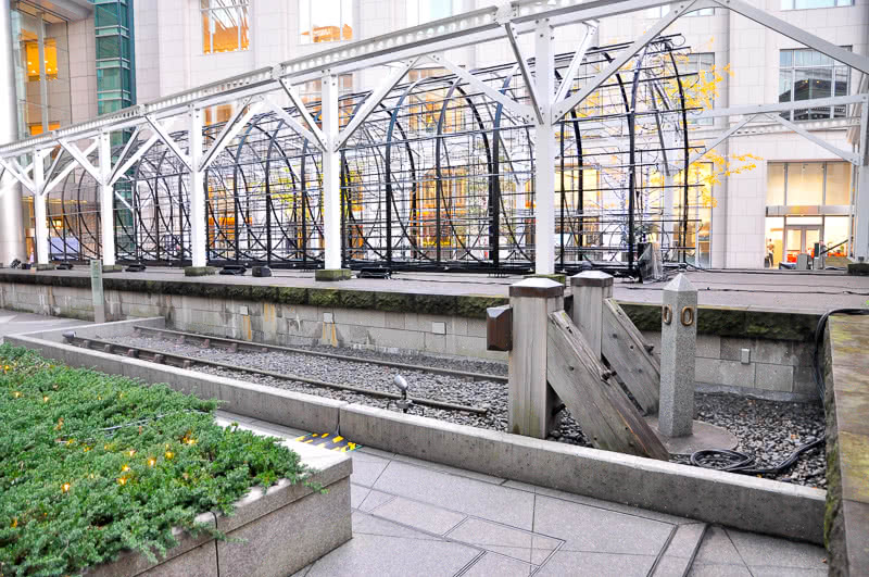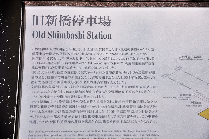 車止めの先に立てられた「0哩標識」。脇に立つ説明板の文によると「1870年4月25日(明治3年3月25日)、測量の起点となる第一杭がこの場所に打ち込まれました。1936年(昭和11年)に日本の鉄道発祥の地として0哩標識と約3mの軌道を復元しました。1958年(昭和33年)10月14日、旧国鉄によって『0哩標識』は鉄道記念物に指定され、1965年(昭和40年)5月12日『旧新橋横浜間鉄道創設起点跡』として国の指定史跡に認定されました。」とのことで、汐留駅があった頃からの史跡になる。