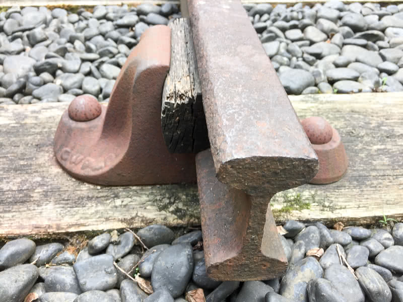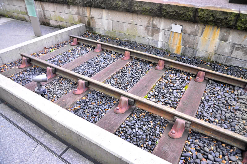 創業当時の線路のバラストが被っていない部分のアップ。こちらも説明板の文によると「創業当時、枕木やレールの台座(チェアー)は小石や砂の混じった土を被らせ、レールの頭だけが地表に出ていました。レール断面は上下対称のI型で、双頭レールといいます。この復元軌道の半分は小石を被せて当時に近い状態を再現し、残りは枕木や台座が見えるようにしました。双頭レールは錬鉄製で、1873年にイギリスのダーリントンで作られ、官設鉄道で使われたあと、新潟県柏崎市の精油所で使われたもので、新日本石油株式会社、新日本石油加工株式会社の両社からご寄贈いただきました。」当時の双頭レール締結の方法が見られるのが嬉しい。