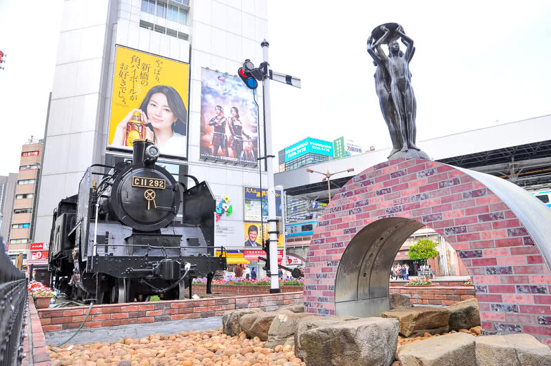 右に立っているのは「愛の像」で、かつては広場の真ん中にいたが、2006年のSL広場改修にともない、この位置に移動してきた。