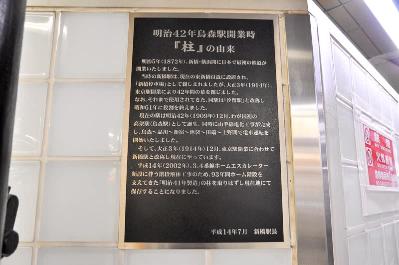 駅南西側の烏森口のラッチを入ってすぐ目の前の、1・2番線ホームと3・4番線ホームへの階段の間のトイレの脇に「明治42年烏森駅開業時の柱」が立っている。この柱は本来はこの位置にあったのではなく、2002年に3・4番線ホームのエスカレータ新設に伴う階段解体工事の時に、取り外して現在位置に保存することになった1本。詳細は写真2枚下の説明文を読んでいただけたらと思う。