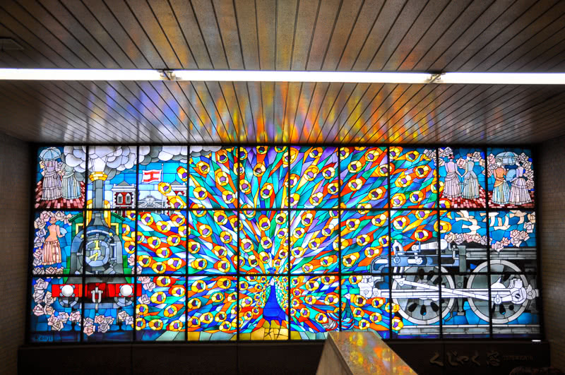 また、この地点から東に目を向けると、20m程先の地下・横須賀線ホームへの階段の上にステンドグラスが飾られているのが見えるが、その図柄の中にSLが取り入れられているので、それも紹介しておこう。この作品名は「くじゃく窓」といい、原画は吉岡堅二氏により、完成は1976年10月1日の同駅・地下ホーム使用開始時になる。