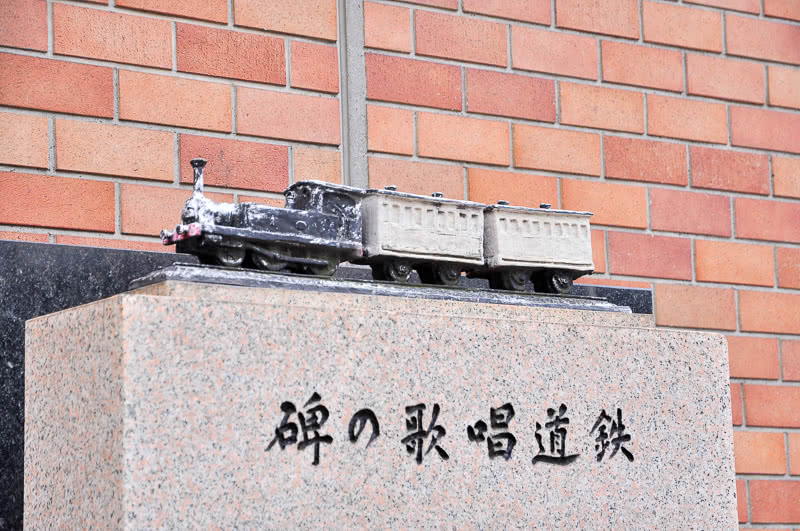 鉄道唱歌の碑の上に飾られた一号機関車+二軸客車2両の編成のミニチュアモデル。ほどほどにデフォルメされたユーモラスなスタイルから躍動感が伝わってくれる。