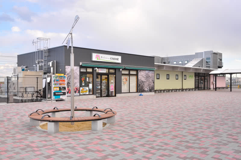 富岡駅舎は100m仙台寄りに移設復旧されたとはいえ、山側に建てられていることに変わりはない。左の「さくらステーションKINONE」は売店で、さらに軽食なども提供販売されていて店の中で食べられる。