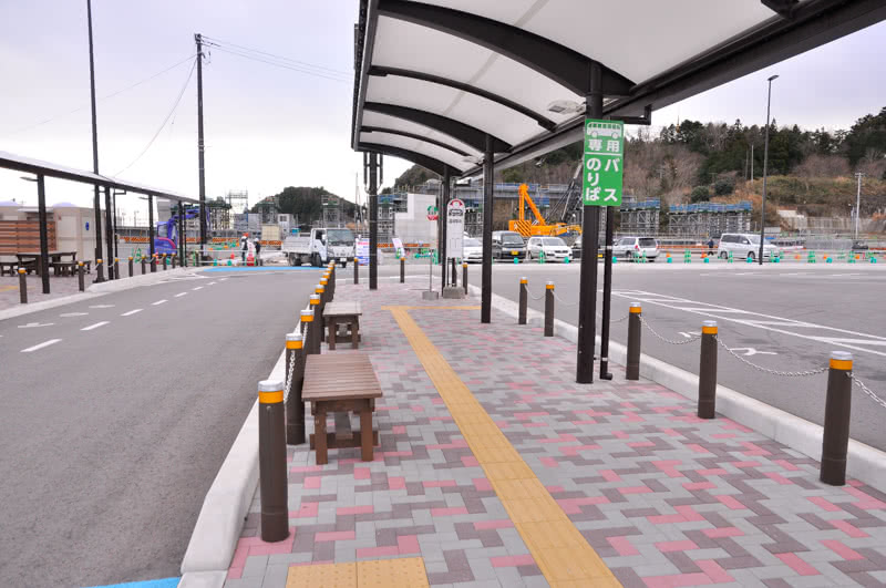 駅前に設置されたバス乗り場。奥左がJR列車代行バスの停留所。奥右は常磐交通のバス停留所。