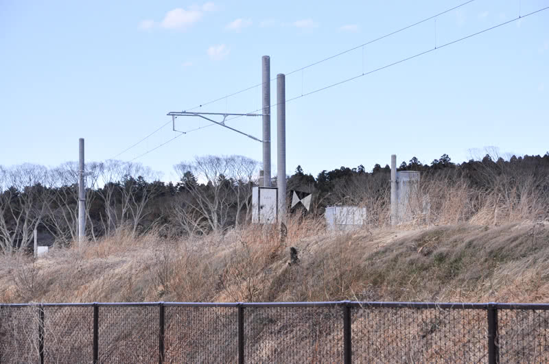 上写真の線路左沿いの道を300mほど仙台方に進んだ位置から右に築堤を見上げると、この架線が途切れた光景に出くわす。