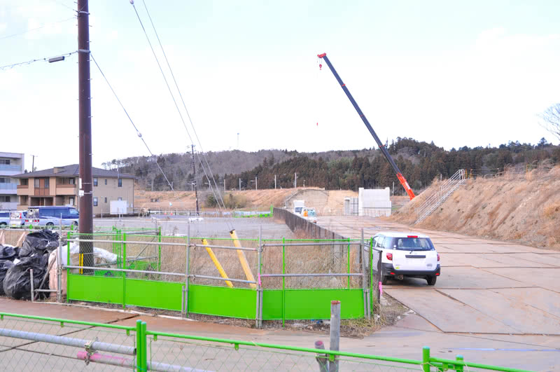 駅西南西200mほどの地点にある サンライズインとみおか へ続く坂道の途中からの富岡駅とその周辺の俯瞰。復興への槌音が響き渡っていた。