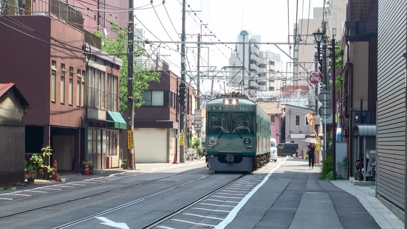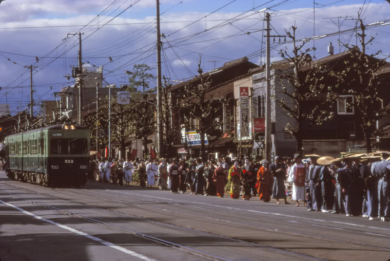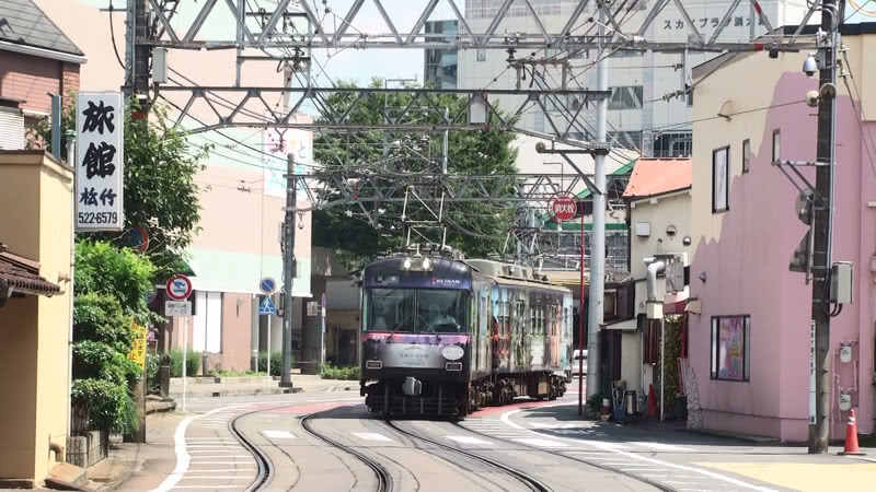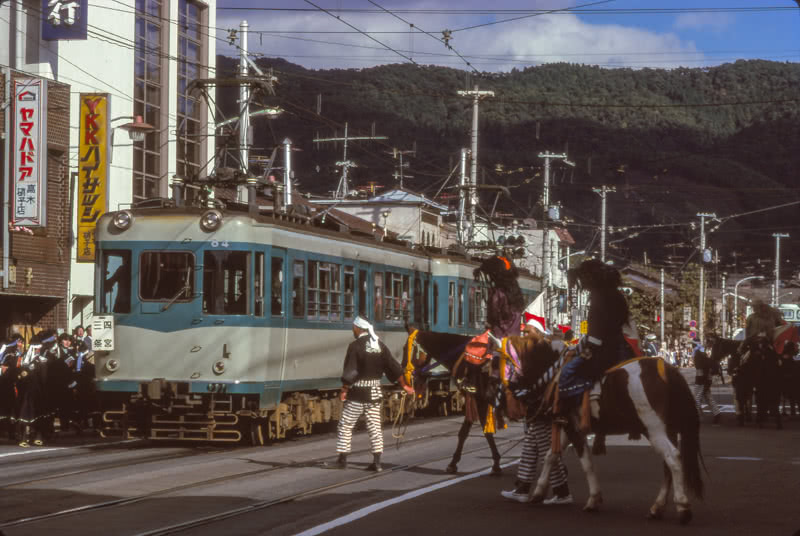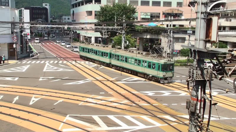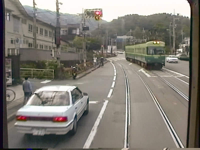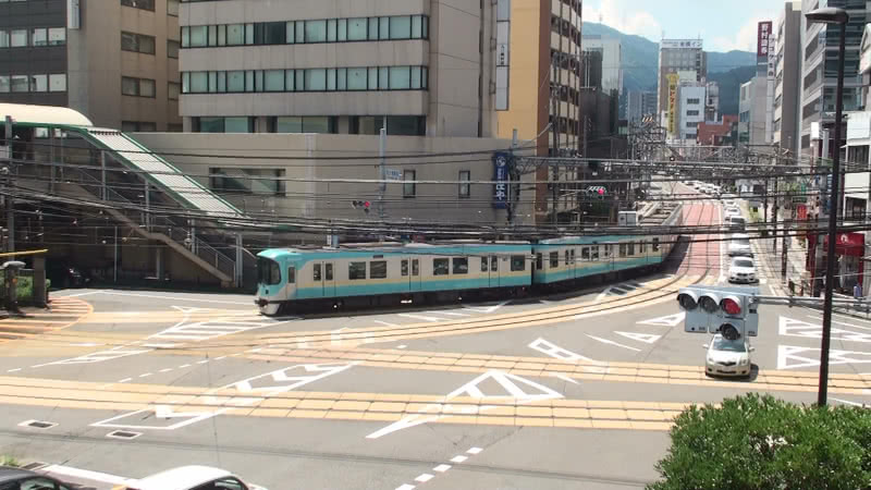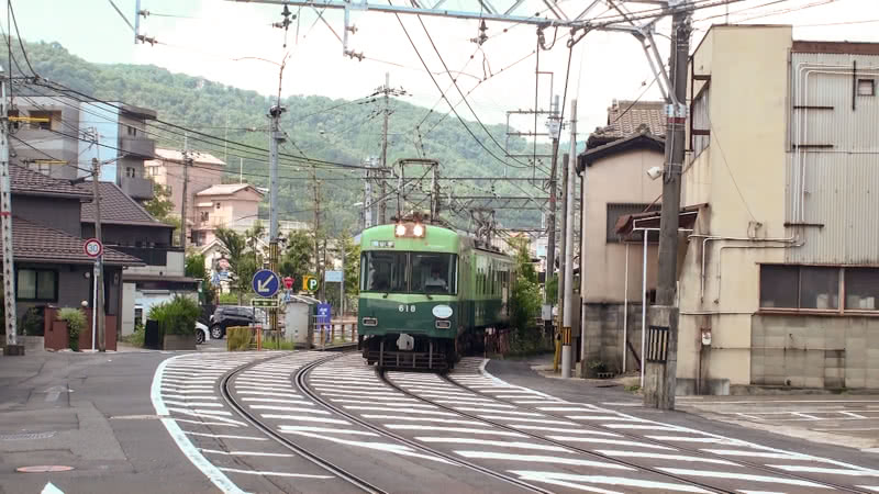 このことは、地下鉄へ乗り入れを開始したのが平成の世になった近年のため、知っている方は多いだろう。さて、そんな京都市内にかつて存在した高床の電車が走る併用軌道区間だが、当然ながら現在は京都市内では見ることができない。ところがそんな当時の光景を懐古させてくれる併用軌道区間が石山坂本線に存在する。