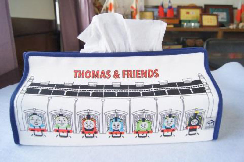 大井川鐵道オリジナルトーマスtenteティッシュBOXカバー。幅25.5cm、高さ6.2cm、奥行12.5cm、綿100%。1,404円(税込)。もう一つ(株)ヘミングスとのコラボ商品で、南海ズームカーティッシュBOXカバーに続く第2弾。フック付で壁に掛けても使え、ラスト1枚まで無駄なく取り出せるデザイン。写真は使用例。(c)2018 Gullane[Thomas]Limted